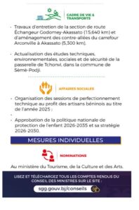 Le gouvernement a également annoncé un ambitieux plan d’investissement dans les infrastructures urbaines. Des collecteurs d’assainissement pluvial seront construits dans plusieurs villes (Allada, Dassa-Zoumè, Pobè, Lokossa, Aplahoué, Djougou, Kandi), afin de renforcer la résilience des villes face aux inondations. En parallèle, des voies connexes seront aménagées pour fluidifier la circulation et améliorer le cadre de vie des populations. Ces projets s’inscrivent dans une stratégie de modernisation urbaine et d’urbanisme durable. Le Conseil a réaffirmé son engagement à soutenir l’insertion professionnelle des jeunes à travers la poursuite du Programme Spécial d’Insertion dans l’Emploi (PSIE). Les autorités insistent sur une gestion rigoureuse des ressources allouées pour en maximiser l’impact. Sur le plan institutionnel, des mesures normatives ont été adoptées, notamment pour renforcer la transparence et l’efficacité des services publics. Le gouvernement a également prévu des actions concrètes pour consolider le système d’évaluation et de contrôle des agents de l’État.