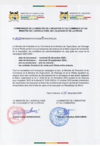 Le gouvernement béninois vient de dévoiler le cadre officiel de la commercialisation du soja grain pour la campagne 2025-2026. Dans un communiqué signé conjointement par la Ministre de l’Industrie et du Commerce, Shadiya Alimatou Assouman, et le Ministre de l’Agriculture, de l’Élevage et de la Pêche, Gaston Cossi Dossouhoui, les deux départements ministériels informent les acteurs de la filière des dispositions qui régiront cette nouvelle saison.Selon le document, la campagne démarre officiellement le vendredi 5 décembre 2025 et prendra fin le mercredi 30 septembre 2026. Durant cette période, les achats et ventes de soja grain se feront librement sur la base d’accords contractuels entre les acteurs, sans prix imposé par l’État.Toutefois, les ministres rappellent l’obligation de respecter scrupuleusement les textes régissant la filière, notamment la loi n°2024-34 du 12 décembre 2024 portant loi de finances pour la gestion 2025, ainsi que le décret n°2022-568 du 12 octobre 2022, qui interdit formellement l’exportation du soja grain et fixe les conditions d’application de cette mesure, également valable pour les noix brutes de cajou.Les deux membres du gouvernement exhortent enfin l’ensemble des producteurs, acheteurs et transformateurs à contribuer au bon déroulement de la campagne, afin de garantir une filière plus compétitive et mieux organisée.
