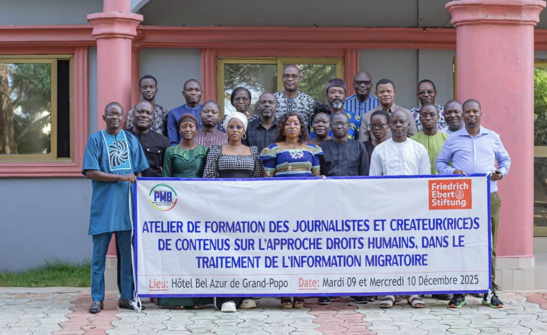 À l’hôtel Bel Azur de Grand-Popo, la Plateforme Multi-Acteurs de la Migration (PMB), avec l’appui de la Fondation Friedrich Ebert Stiftung (FES), a organisé les 9 et 10 décembre 2025 deux jours de formation à l’intention des journalistes et créateurs de contenus. Un atelier consacré au traitement médiatique de la migration sous l’angle des droits humains.