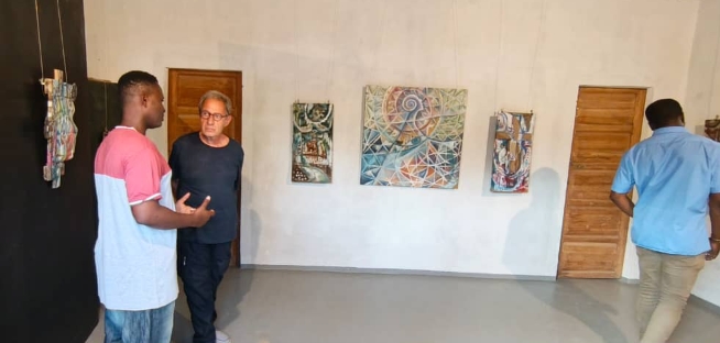 L’espace culturel Kulturforum Süd-Nord de Togbin Plage accueille, du 20 septembre au 2 novembre 2025, l’exposition de fin de résidence de Seïdou Moubarack. Intitulée La Porte et Moi, elle réunit des peintures et sculptures réalisées sur bois, carton et toile. Plus qu’un simple passage, la porte devient, sous son pinceau, symbole, mémoire et miroir de l’âme. Elle relie l’intérieur et l’extérieur, le connu et l’inconnu, invitant le spectateur à franchir des seuils vers la lumière, l’introspection et le mystère. À l’issue de sa résidence artistique, Seïdou Moubarack présente au Kulturforum Süd-Nord de Togbin Plage une série d’œuvres réunies sous le titre La Porte et Moi. Exposées du 20 septembre au 2 novembre 2025, ses peintures et sculptures sur bois, carton et toile explorent la métaphore de la porte comme seuil entre visible et invisible, intime et universel. Plus qu’un simple passage, elle devient sous son pinceau symbole, mémoire et miroir de l’âme, reliant intérieur et extérieur, connu et inconnu, et invitant le spectateur à une traversée vers la lumière, l’introspection et le mystère. L’artiste a expliqué que son projet « est profondément intime et vise à refléter, à travers l’art, les expériences de la vie quotidienne de chacun ». Selon lui, La Porte et Moi agit comme un miroir universel : « Le moi, c’est nous, le moi est universel. » Moubarack invite ainsi le spectateur à s’interroger : « Qu’y a-t-il derrière la porte ? » et à franchir ce seuil pour découvrir des dimensions à la fois personnelles et collectives.Dans son exploration poétique et symbolique, il interroge le rôle universel de la porte comme seuil et passage. Plus qu’un objet fonctionnel, elle est mémoire et témoin, notamment dans les traditions africaines où les portes sculptées racontent l’histoire des lignées et des ancêtres. Elle devient aussi espace de création, miroir de soi et lieu de choix : ce que l’on décide de garder ou de laisser derrière. La réflexion convoque des penseurs comme Bachelard, Rilke, Amadou Hampâté Bâ, Paulin Joachim ou encore Souleymane Bachir Diagne, pour montrer que chaque porte franchie est une traversée intérieure et un geste de connaissance de soi. Le vernissage du 20 septembre a réuni plusieurs personnalités du corps diplomatique, des autorités culturelles et universitaires, ainsi que des parents, les voisines et voisins de Togbin, amis et passionnés d’art venus soutenir le jeune peintre.