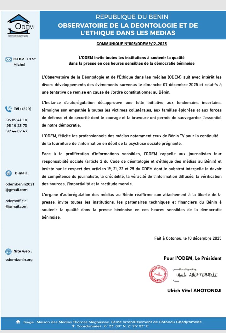 Dans un communiqué rendu public et signé en date du 10 décembre 2025 par son président Ulrich Vital Ahotondji, l’ODEM réagit aux événements du 7 décembre et appelle les journalistes à une rigueur exemplaire. L’instance invite également les institutions et partenaires à soutenir une presse responsable et de qualité.