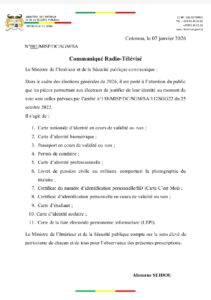 Dans un communiqué en date de ce mercredi 07 janvier 2026, le ministre de l’Intérieur et de la sécurité publique, Alassane SEIDOU rappelle aux populations, les pièces pouvant permettre aux électeurs de justifier de leur identité le jour du vote. Découvrez l’intégralité de ces pièces dans le communiqué ci-dessous.